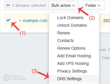 4. Check the box next to your domain name(s) and click on the DNS Settings from the Bulk action drop-down menu.